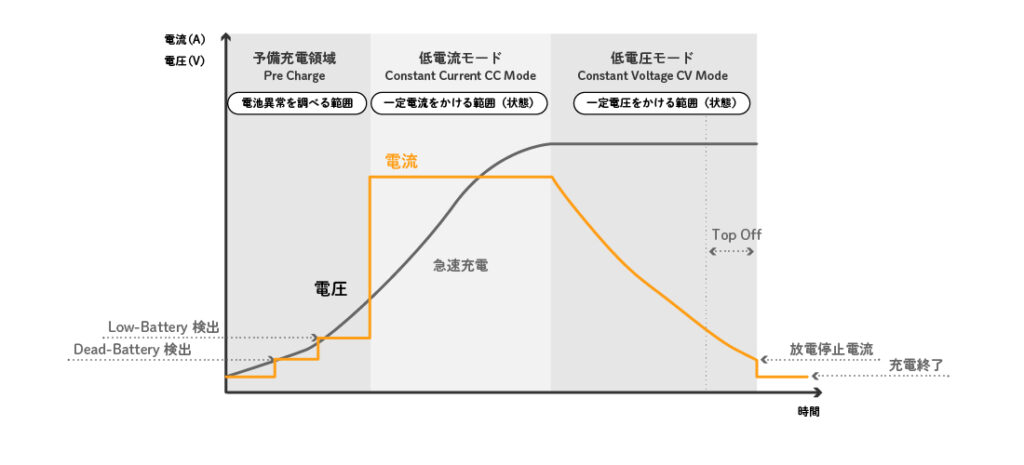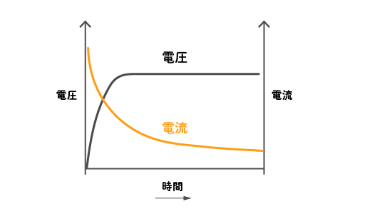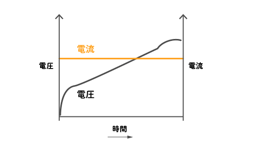 一定の電流を保って充電する充電方式で、充電時間の予測が容易です。充電電圧は電流の流れ具合により変化します。